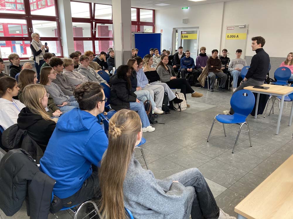 Versammelt hatten sich im Multifunktionsraum knapp 50 Oberstufenschülerinnen und -schüler, die sich in den kommenden Monaten mit dieser Thematik auseinandersetzen müssen und denen die Ernsthaftigkeit der derzeitigen weltpolitischen Lage in Anbetracht der Bedrohung durch Russland und der veränderten Beziehungen zu den USA durchaus bewusst war. Umso dankbarer waren die Oberstufenschülerinnen und -schüler, dass ein Vertreter der Regierungskoalition im Bundestag sich Zeit nahm, um sich den Fragen und Bedenken zu stellen, um authentisch die aktuelle Lage und die Notwendigkeit einer zuverlässigen Bundeswehr zu beurteilen, obwohl er selbst nach seinem Abitur den Kriegsdienst verweigerte, aber heute seine damalige Entscheidung neu bewerten würden, falls notwendig.